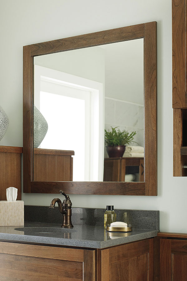 A framed wall mirror adds a dashing touch to the bath, and coordinates with other pieces.